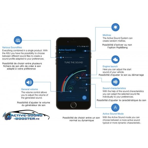 L'application Smartphone Active Sound Gateway BLE permet de télécharger le programme de votre véhicule, de vous créer des profils de son différents (6), de paramétrer le son de votre Active Sound Booster (Activation, Son, Volume, Régime moteur, Ralenti, Pop&bang), de faire un diagnostique de votre installation et de faire les mises à jour (Gratuite).